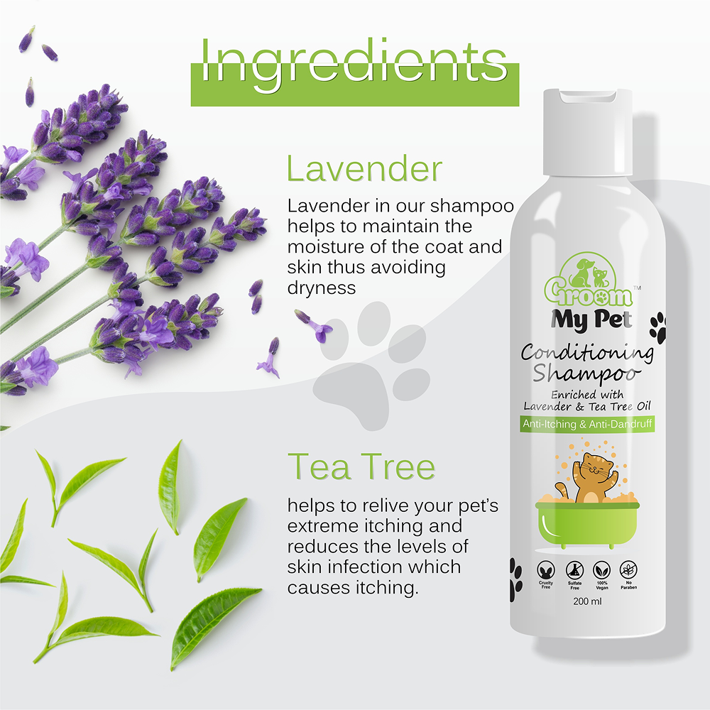 Groom My Pet Cat Conditioning Shampoo enriched with lavender and tea tree oil it helps to provide relief from itchiness and dandruff makes your pet more comfortable. Lavender helps to retain the moisture of the coat and skin which reduces the dryness and controls dandruff. Tea tree oil has anti-bacterial and anti-fungal properties which helps to reduce itching .