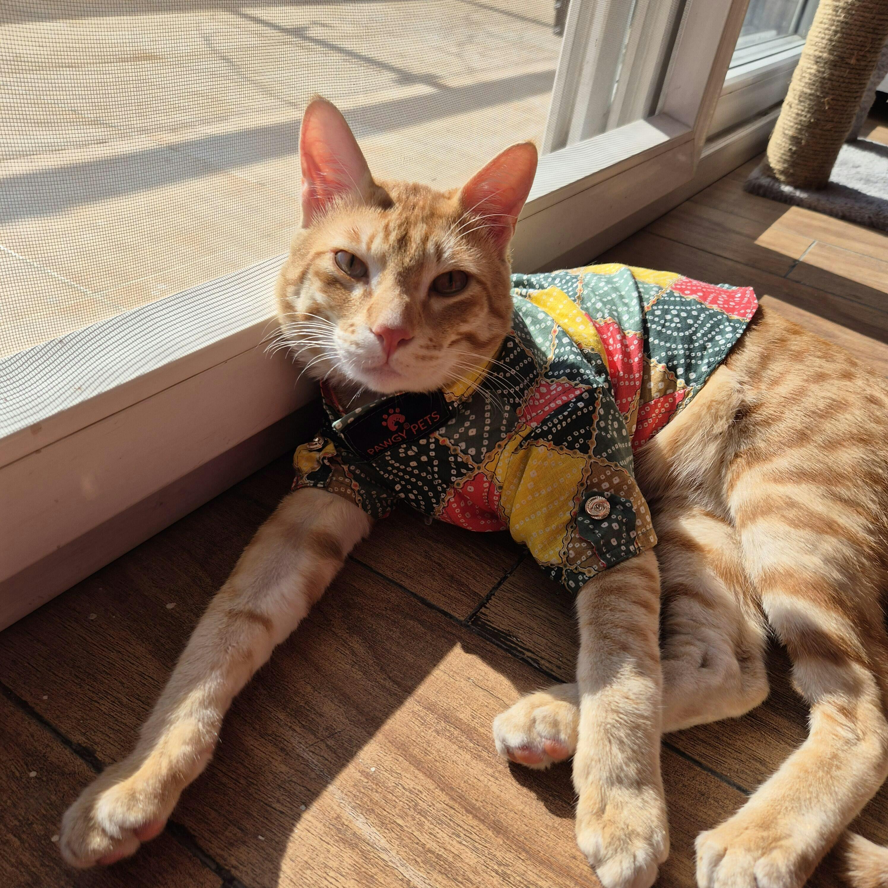 A touch of Indianess is a must in every household. A perfect kurta for all occasions from Rakha Bandhan to your family sangeet function, it'll make your pet a part of the occasion.Our ethnic dog shirt will help you reconnect with your Indian textile roots because it is made of cotton that has been naturally coloured and has the enduring Dabu hand block pattern on it. In addition, this soft dog shirt has a classy mandarin collar and short, raglan sleeves. The shirt has full velcro on the front for comfort during wear. The high tummy cut makes it easier for your pet to pee!