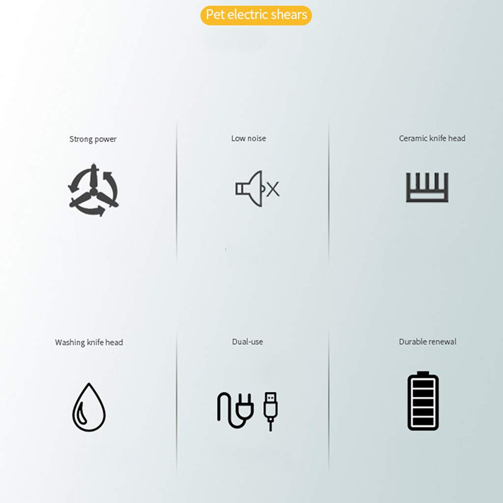 Fully charge the clippers before using for the first time or if it hasn't been used for a long time. Attach the desired guard comb for clipping hair of a specific length. Ensure the pet is calm before grooming. If the pet has extremely long and thick hair, use scissors to cut the hair shorter first. Be aware that the motor may produce some noise, and not all pets may adapt to it. Use the scissors to cut long hair first if the pet has thick, curly hair. Clean the clippers after use.