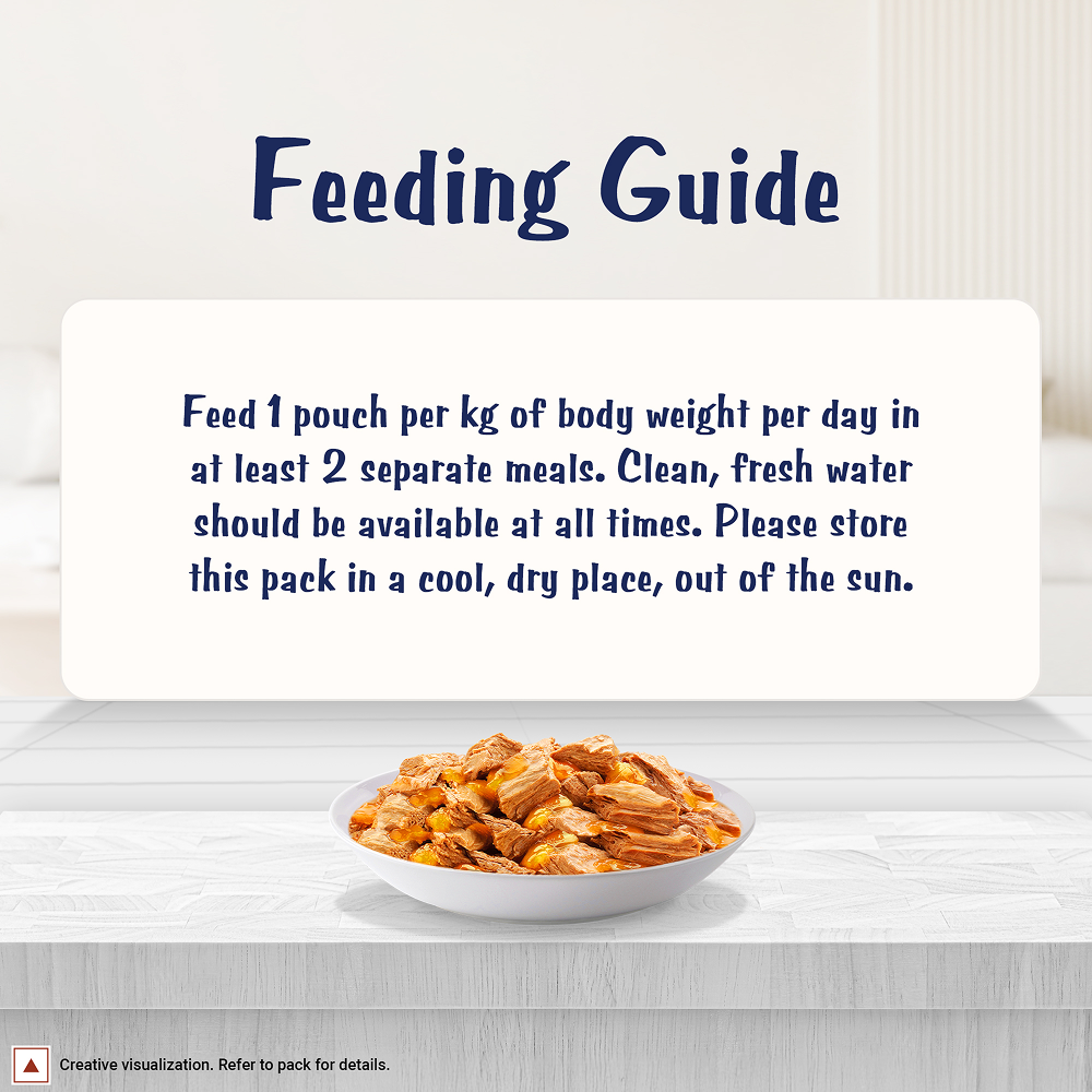 Feed one pouch per kg of body weight per day in atleast 2 separate meals.