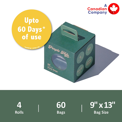 Purple Tails Poop Bags, inspired by our Canadian origins, combine durability and eco-consciousness to make cleanups quick and hassle-free. Made with 65% certified recycled plastic and designed to be strong and reliable, they help pet parents care for their pets and the planet with ease.