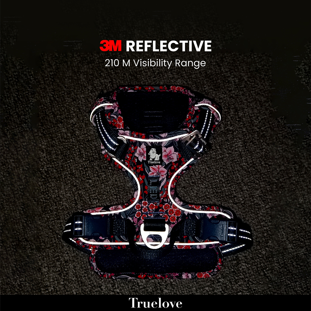 Introducing the BarkButler x Truelove Floral No-Pull Cordura Dog Harness, specially designed for strong pullers. The no-pull design makes sure your dog doesn't lunge forward into a strap, correcting their walking behaviour and increasing safety. This dog harness features a smart neck buckle, offering a new and easier way to take the harness off and put it on. Made of aviation-grade aluminium, the buckle is both lightweight and strong. With aluminium alloy dual rings that prevent pulling, these dog harnesses offer a durable and robust design that's built to last. The straps have 3M reflective stitching, enhancing visibility for those late-evening walks. It makes this dog belt visible as much as 210 m away in the darkness, and adds safety to your night-time walks. This harness is made using sandwich-padded soft mesh and covered with durable and soft Cordura fabric for added toughness and comfort. Our chest belt for dogs is not only durable but also multi-functional. There is an extra strap sewn into the top of the vest that can be used for attaching small accessories like keys or small bags, freeing your hand to better enjoy your walk. It has a nylon safety handle in the back which allows you to hold the harness from multiple positions depending on the usage. This harness is especially useful for walking on roads with traffic, allowing for easier control. This is a must-have harness for strong pull management. Our Truelove dog harness works great for dogs of all sizes, whether you use it as a dog belt for large dogs, harness for dogs medium size, or harness for puppy. Don't think twice about the BarkButler x Truelove No-Pull Cordura Dog Harness, the only harness you will ever need.