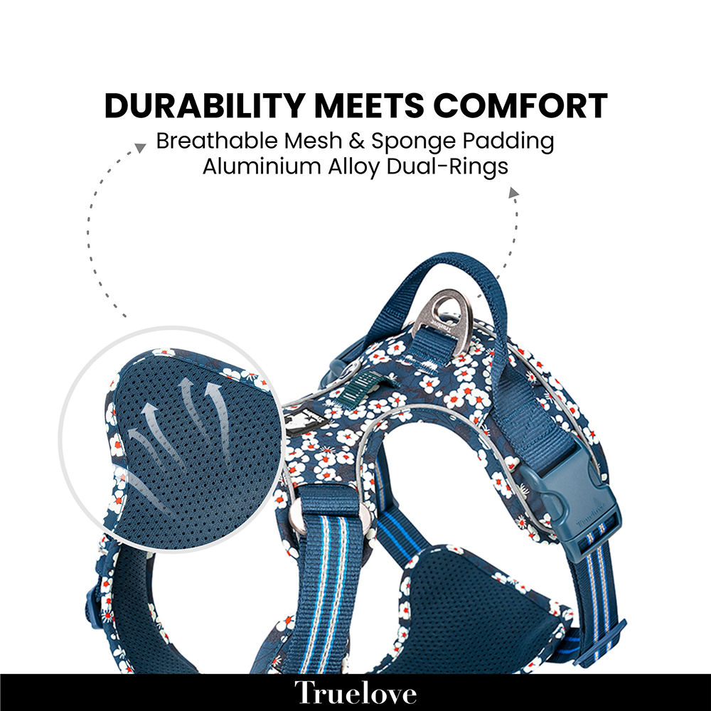 This dog harness features a smart neck buckle, offering a new and easier way to take the harness off and put it on. Made of aviation-grade aluminium, the buckle is both lightweight and strong. With aluminium alloy dual rings that prevent pulling, these dog harnesses offer a durable and robust design that's built to last. The straps have 3M reflective stitching, enhancing visibility for those late-evening walks. It makes this dog belt visible as much as 210 m away in the darkness, and adds safety to your night-time walks. This harness is made using sandwhich-padded soft mesh and covered with durable and soft Cordura fabric for added toughness and comfort. Our chest belt for dogs is not only durable but also multi-functional. There is an extra strap sewn into the top of the vest that can be used for attaching small accessories like keys or small bags, freeing your hand to better enjoy your walk. It has a nylon safety handle in the back which allows you to hold the harness from multiple positions depending on the usage. This harness is especially useful for walking on roads with traffic, allowing for easier control. This is a must-have harness for strong pull management. Our Truelove dog harness works great for dogs of all sizes, whether you use it as a dog belt for large dogs, harness for dogs medium size, or harness for puppy. Don't think twice about the BarkButler x Truelove No-Pull Cordura Dog Harness, the only harness you will ever need.