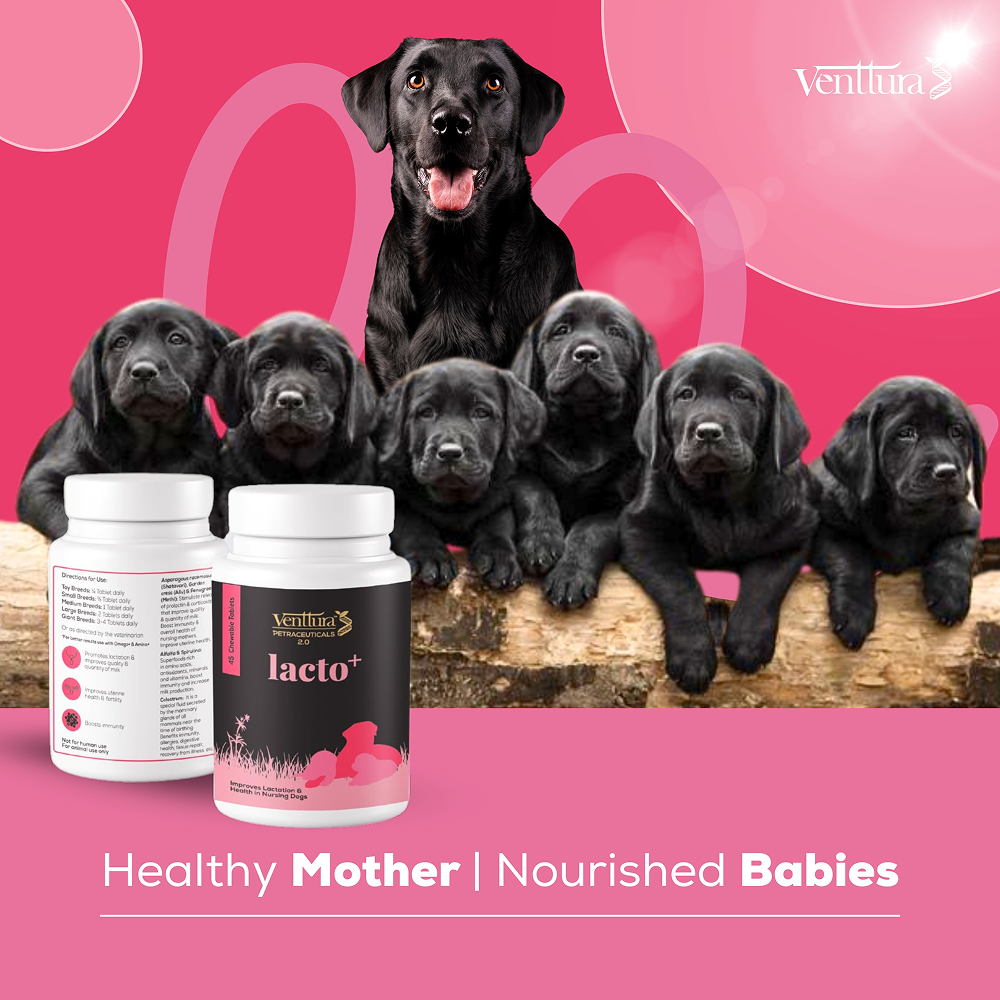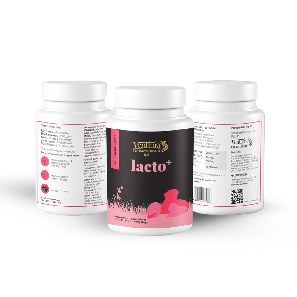 Venttura Lacto+ Formula Enhances Lactation & Promotes Health in Nursing Dogs: Elevate your dog's nursing experience with our comprehensive solution, Lacto+. Formulated to meet the heightened nutritional demands of lactating dogs, Lacto+ not only supplements the diet but actively promotes lactation, enhancing both the quality and quantity of milk produced. Paired with a balanced diet, the synergistic effects of omega+ and amino+ supplements further optimize maternal health and milk production. Omega+ delivers essential fatty acids crucial for overall health, while amino+ provides vital amino acids necessary for muscle growth and tissue repair. Ensure the well-being of both mother and pups by incorporating our trio of supplements—Lacto+Holistic Formula Enhances Lactation & Promotes Health in Nursing Dogs: Elevate your dog's nursing experience with our comprehensive solution, Lacto+. Formulated to meet the heightened nutritional demands of lactating dogs, Lacto+ not only supplements the diet but actively promotes lactation, enhancing both the quality and quantity of milk produced. Paired with a balanced diet, the synergistic effects of omega+ and amino+ supplements further optimize maternal health and milk production. Ensure the well-being of both mother and pups by incorporating our trio of supplements—Lacto+, Omega+, and Amino+—into your nursing dog's regimen.