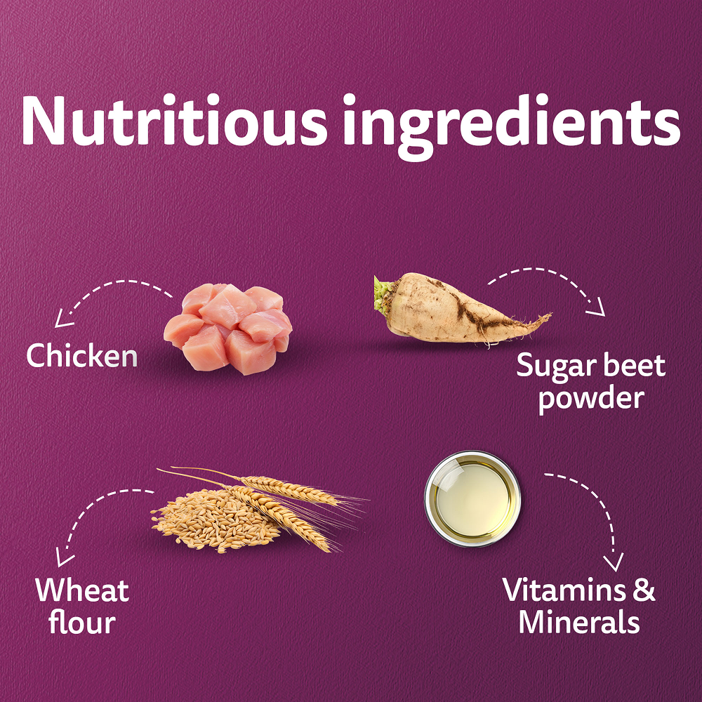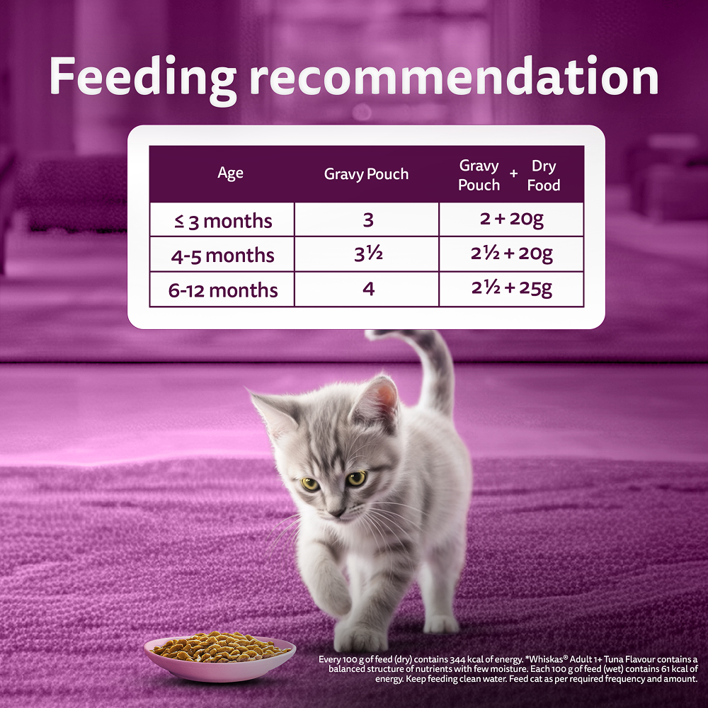 Whiskas wet meal (kitten food) chicken in gravy pouches are tasty and contain the same nutrition you’ve come to expect