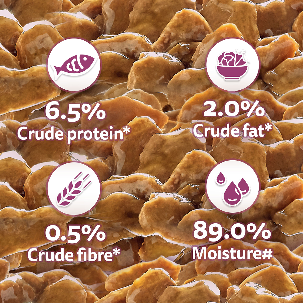 Whiskas gravy texture and aroma appeals to the feline palate and attracts even fussy eaters!